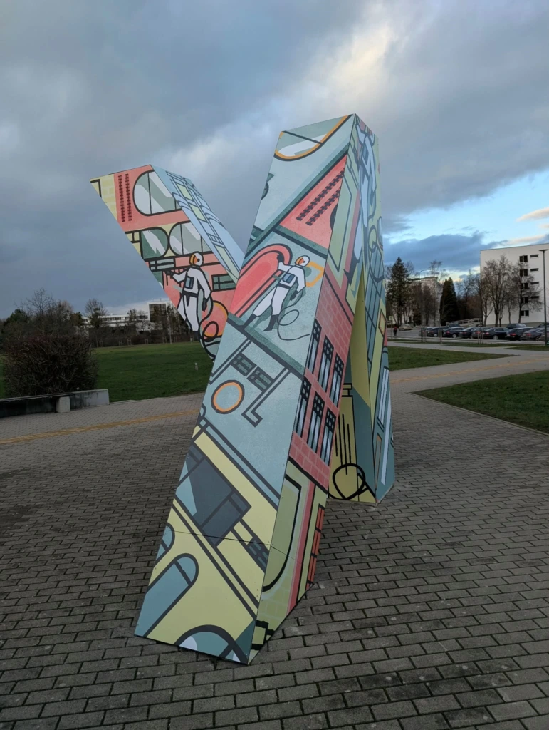 Vienijami UNESCO kūrybinių miestų tinklo, Kauną bei Kortreiką taip pat sieja ir modernistinė architektūra, o kartu su ja – ir platesnė miestų tapatybė. Ant naujo objekto „rūbo“ – atpažįstami, tačiau nebūtinai konkretūs modernizmo simboliai – apvalūs langai, aptakios pastatų linijos ir kosmonauto kostiumu apsirengęs žmogus, keliaujantis tarp vertingos miesto istorijos ir kūrybiškos ateities.